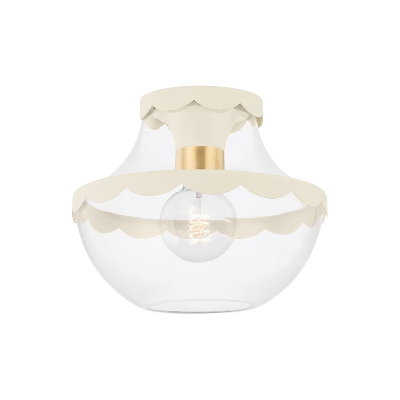 Soften a modern living space with the delightful Alaina Semi Flush Mount Ceiling Light from Mitzi and notice an elevated level of charm making a difference. This romantic fixture simplifies and streamlines fashion and function with a shapely bell shaped shade made of sparkling clear glass, as aged brass details infuse a drop of glam and cream scalloped details put finishing touches on an artistic source of ambient lighting.