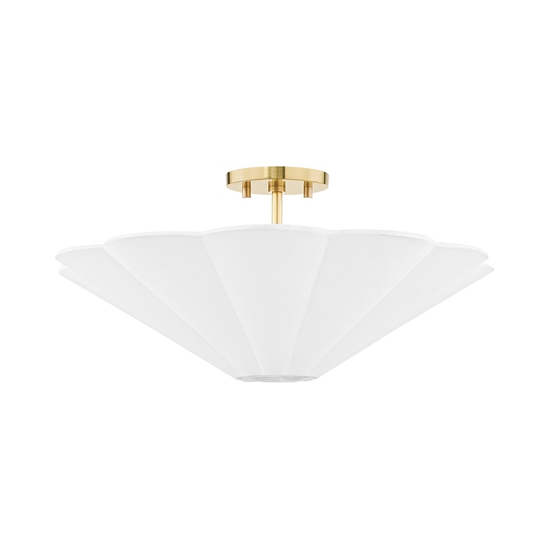OverviewDesigned with an elegantly scalloped linen shade, the retro-inspired Mid-Century Modern Alana Semi Flush Mount Ceiling Light from Mitzi lends a sophisticated flair to interiors. Luxurious warm tones brought on by the aged brass mount and recessed f