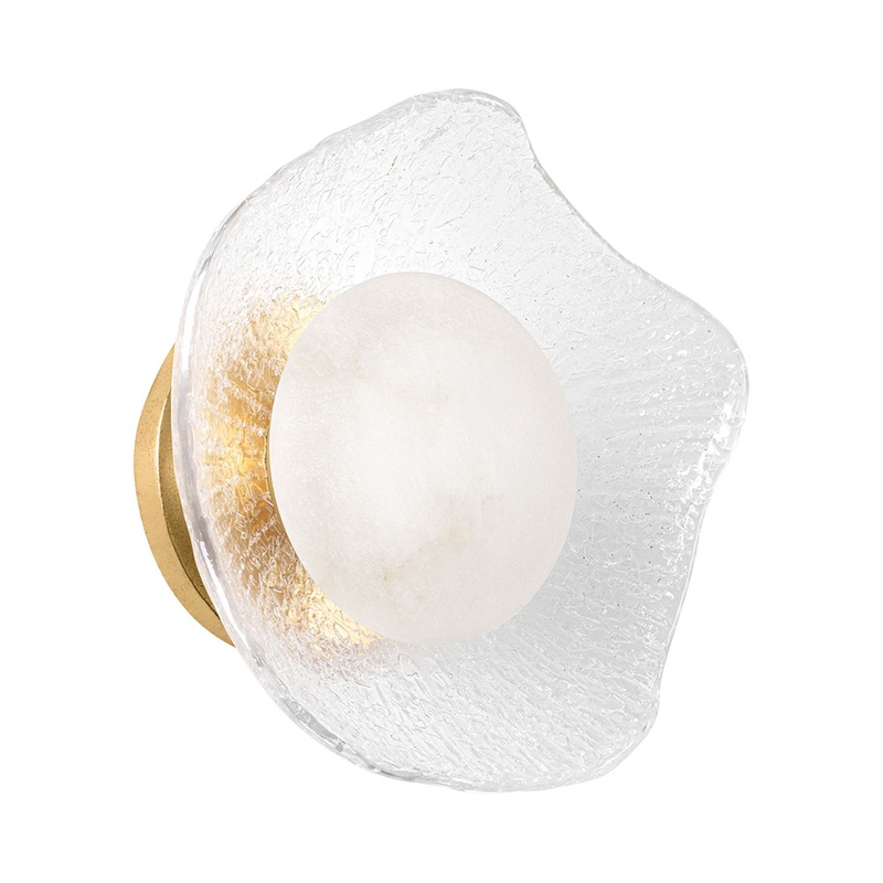 As a decadent light fixture, the Almandine LED Wall Light from Corbett Lighting delivers the fine artisan vibe of primary dcor. Its material mix joins vintage gold finish iron backing affixed to a shapely cast glass piece and centered with an exotic natural stone diffuser. Its ultimate aesthetic mirrors that of a bejeweled gem with just enough casual versatility to make a point.