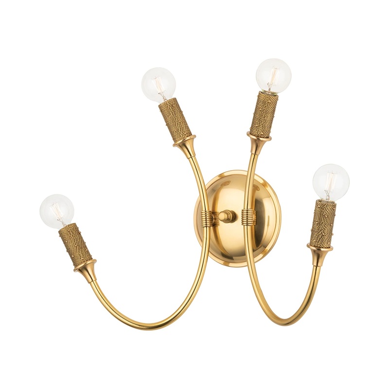 Swooping curves create a sense of freeform energy and whimsy for the Amboy Wall Light from Hudson Valley Lighting. Setting the tone in a welcoming living space, the sconce delivers intriguing reflectivity with wire-wrapped socket cups and incredible warmth with aged brass finish updated for a modern sensibility.