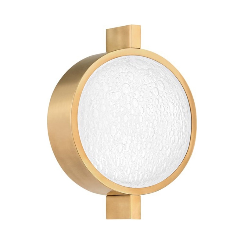 A vintage brass finish bezel hosts a jewel-like disc of seeded Sprite glass to create the warmly elegant Ansonia LED Wall Light from Corbett Lighting. Pleasing in its simplicity, the fixture infuses watery character with bubbly personality, perfect for a sophisticated entry or living room.