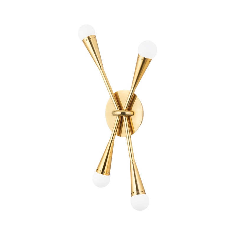 OverviewPush atomic age Midcentury vibes with the Aries Bath Wall Light from Corbett Lighting, featuring conical shape frame design complete with perforated edges for a sparkle effect. A warm brass metallic finish offers up dramatic glam touches. Topped of