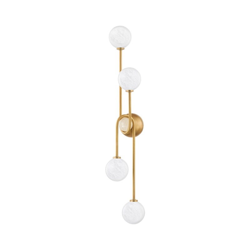 Glass orbs float and fall, creating an unexpected silhouette for the modern Astro Wall Light from Corbett Lighting. Seeded with whimsy, the fixture features slender arms wrapping around a central point, each capped with a cloud glass globe that glows brightly in a bedroom, bath, or foyer. Vintage brass finishing lends warm the glamour for a sophisticated touch.