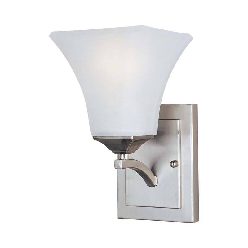 A tasteful and versatile design flatters master and guest bath venues as the Aurora Bath Wall Light from Maxim Lighting approaches aesthetics with an easy visual. Satin nickel finish steel construction adds clean lines and a charming curved arm, adding just enough detail to impress. Ambient light flows through an artisan-inspired frosted glass tapered and squared shade.