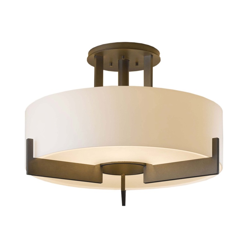 A drum shade within a confluence of three spokes creates an engaging look for the Axis Semi-Flush Mount Ceiling Light from Hubbardton Forge.