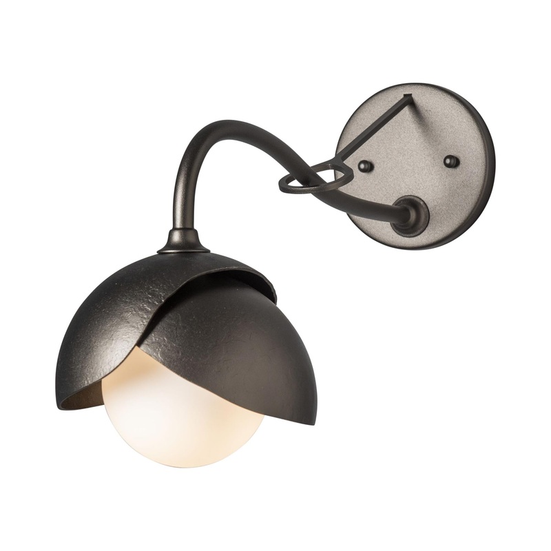 A glowing globe of opal glass peeks from underneath the overlapping domes of hand-forged, hammered steel that create the shade of the Brooklyn Long Arm Double Bath Wall Light from Hubbardton Forge. A loop accent decorates the long arm of the sconce, adding another dimension to its compelling silhouette.