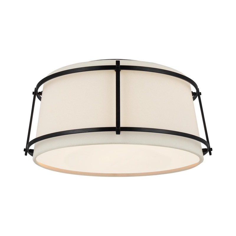 OverviewA high contrast design pairs a metal frame with a linen drum to create a layered effect for the Callaway Flush Mount Ceiling Light from Visual Comfort Signature. Perfect for a bedroom or home office, it delivers true, diffused illumination with two