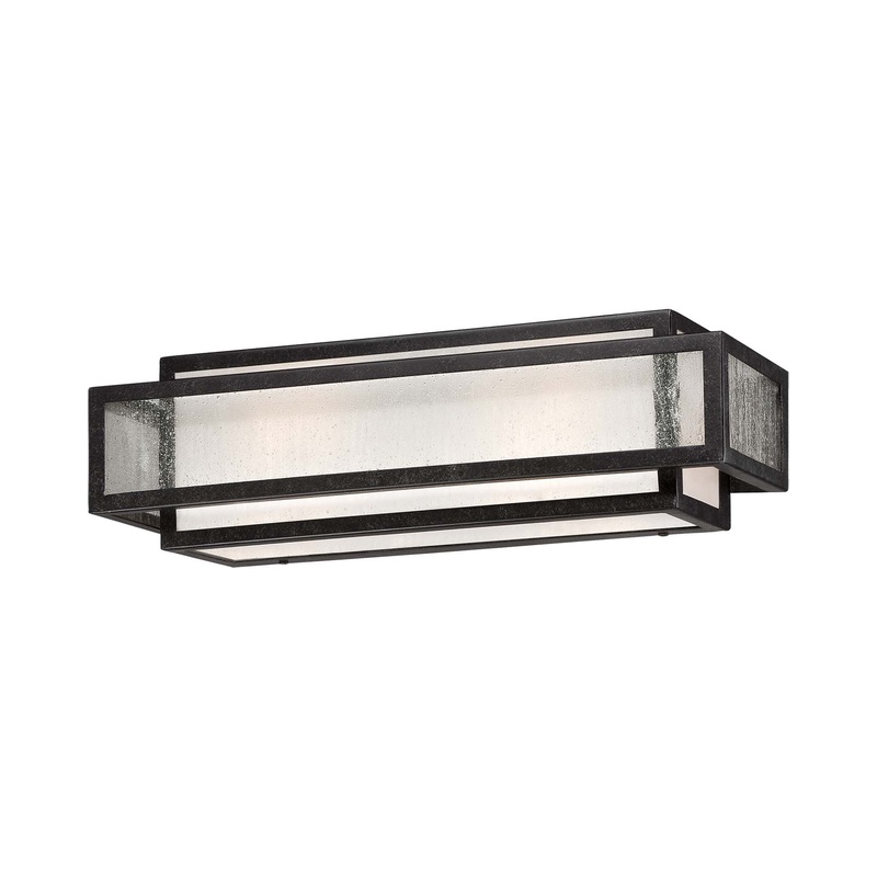 A boxy design beckons timeless elegance with a crisp look, perfect for highlighting vanities in modern or transitional bath spaces. The Camden Square Bath Wall Light from Minka Lavery delivers a bold charcoal finish to metal framing, with clear seeded glass and etched glass filtering ambient light. This fixture adds a compelling design element with a geometric twist.