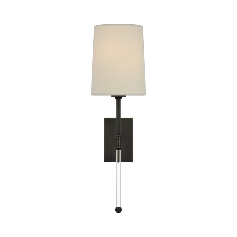 Embrace a touch of classic American style in a non-wired sconce with a timeless design. The Camille Wall Light from Visual Comfort Signature mirrors conventional lamped aesthetics with a slight repurposing, as metal framing and a tall fabric shade brings stability. Turned elements and a rectangular backplate deliver contrasting elements to an energy-efficient, rechargeable wall light with dimming features.