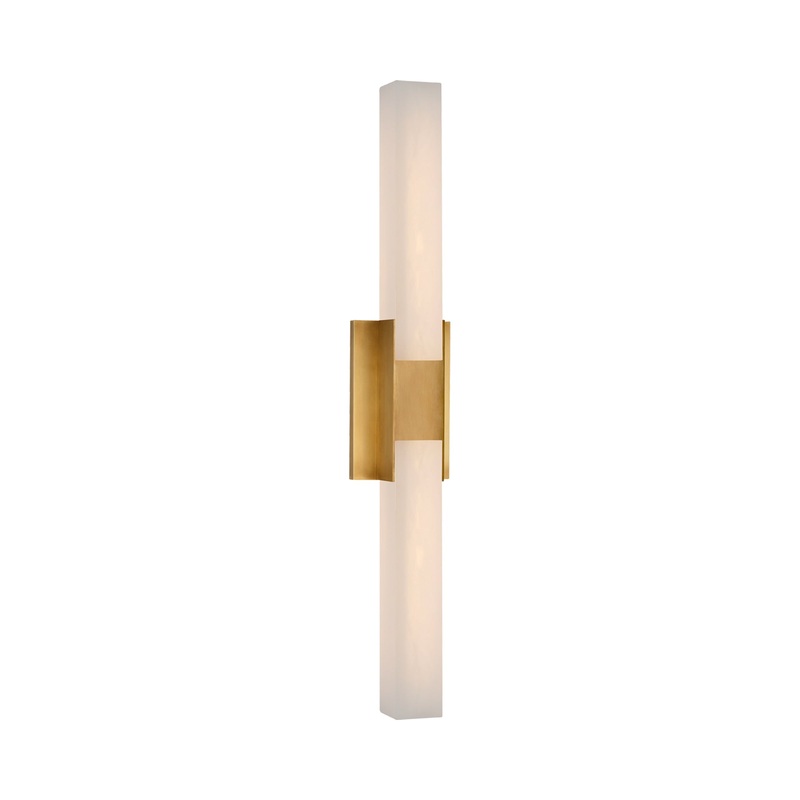 Elegance turns to geometric proportions in a light fixture that lifts the level of sophistication in a modern bath space. The Covet LED Bath Wall Light from Visual Comfort Signature creates an optically pleasing spatial impact with an elongated boxy alabaster shade snuggling a metal frame with a distinctive sleeve offering a dividing line. Beautifully soft and energy-efficient lighting is the result, making a stellar difference in a custom en suite or guest bathroom.
