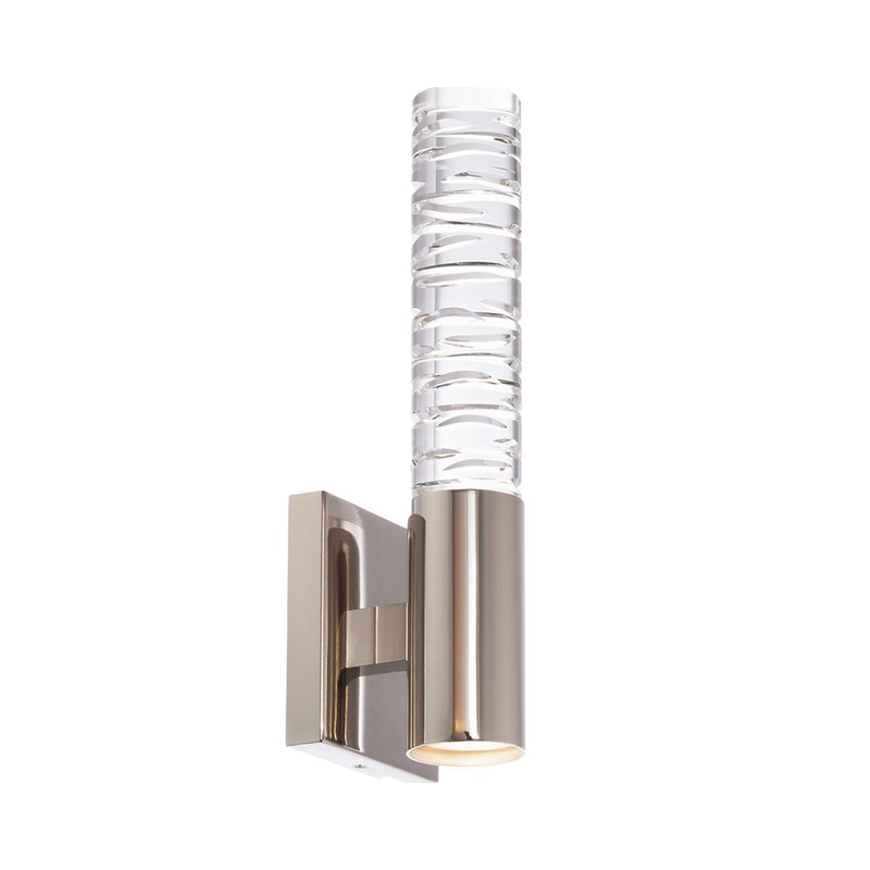 Elegant and inspired by nature, the Cru LED Bath Wall Light from Schonbek boasts a clear cylindrical shade in a colliding tectonic plate-like effect. Spreading a stunning scintillation across walls, this energy-efficient bath wall light offers a modern glam aesthetic and a minimalist flair, presented in its lustrous polished nickel finish and slender silhouette.