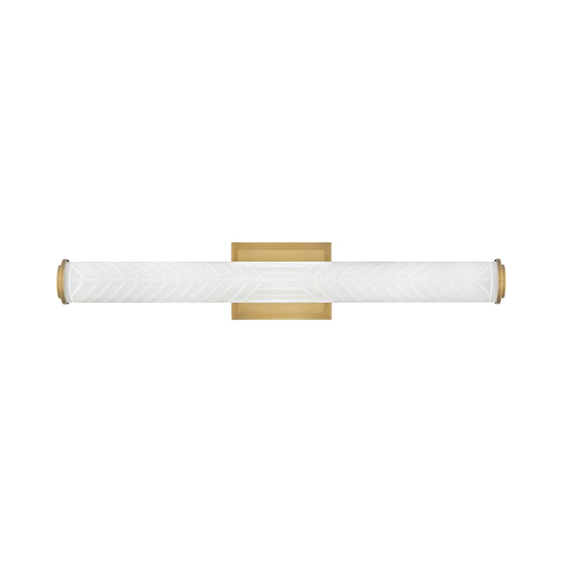 Elegant horizontal orientation and a cylinder shape delivers a perfect source of illumination to highlight a bath vanity. The Devon LED Bath Vanity Light from Hinkley maintains simplicity with sophistication, mixing lush lacquered brass metal framing with an etched white cylinder shade capped with matching metal ends. The minimalism of this light offers exemplary versatility.