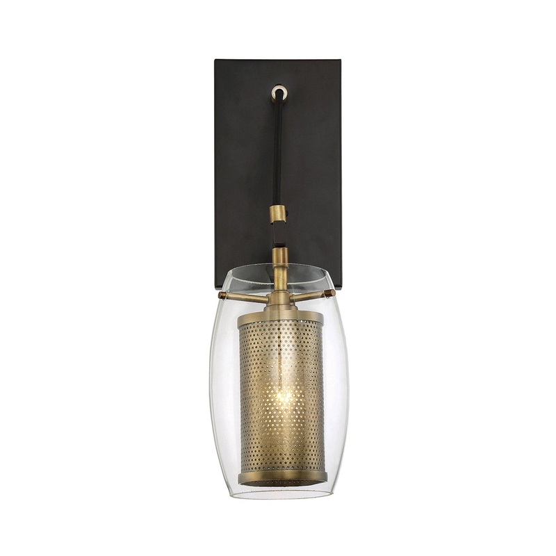 Capture a masterful pairing of modern and industrial styles with the Dunbar Wall Light from Savoy House. Epic design elements pair bold metal in two finishes, including a dark bronze wall plate and an internal mesh shade offering a warm brass finish with bronze accents. The romantic look of a clear glass barrel shade sews together a perfect mix of glam suited to a transitional or modern setting.