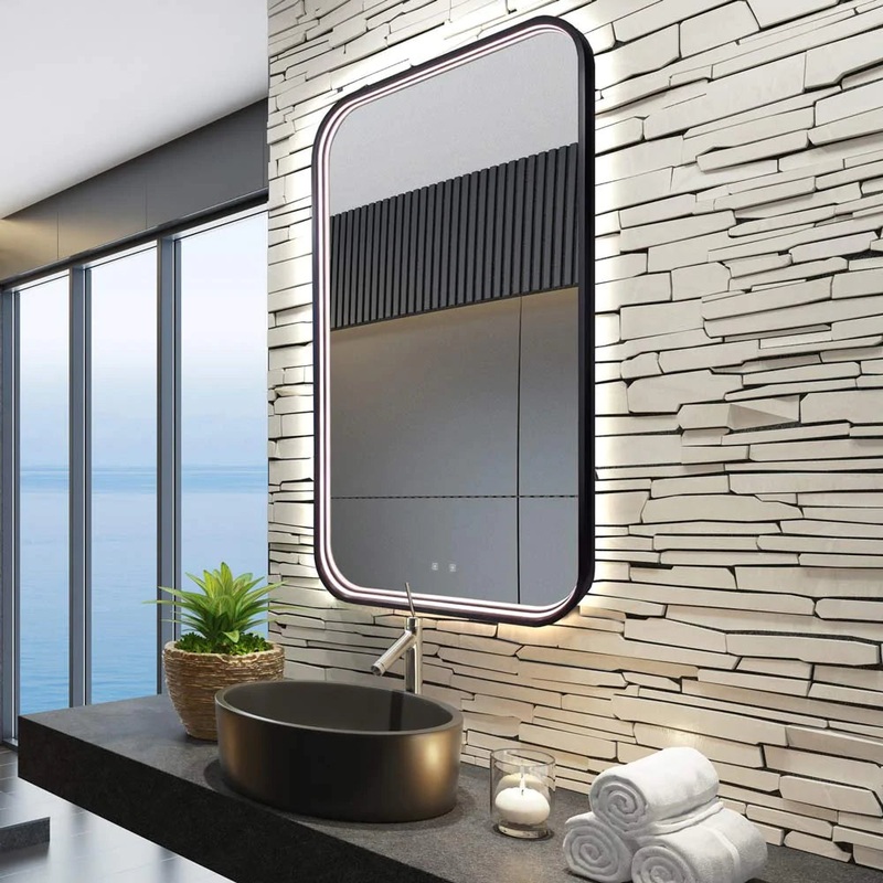 Unique shadowbox design elevates the modern allure of the Eminence LED Lighted Mirror from Electric Mirror. An ambient glow washes the wall behind while inward-facing lights on the front of the mirror provide wonderful illumination for daily grooming and beauty rituals. Delicately balancing form and function, the mirror is complete with a crisp black finish and rounded corners for a chic touch over any vanity.