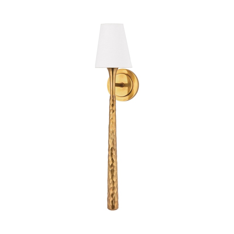 Classic reworking of a conventional lamp design tells the story of modern elegance as the Greta Wall Light from Corbett Lighting becomes an integral part of interior lighting. Vintage brass finish metal is texturized and stretched into an elongated stem capped with a petite white linen shade, offering a radiant warmth and a delicate aesthetic.