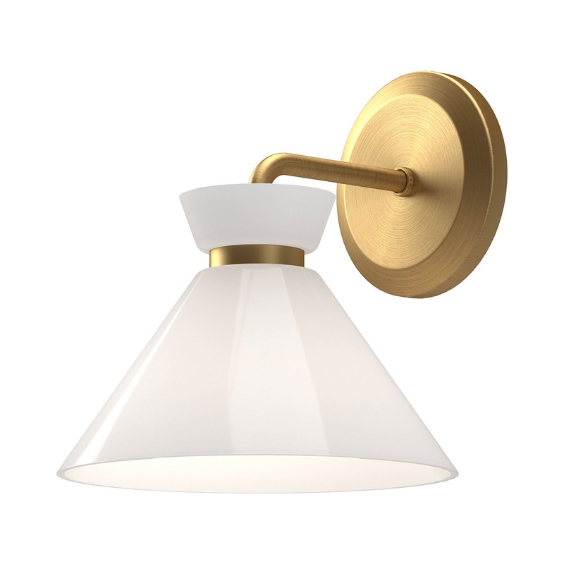 Subtle panels embellish a bell shade, filtering light in a romantic way and bringing an artistic look to the Halston Wall Light from Alora Mood. Vintage appeal carves out a basic motif for this fixture that makes the most of classic metal and uses geometry in an eye-catching design.