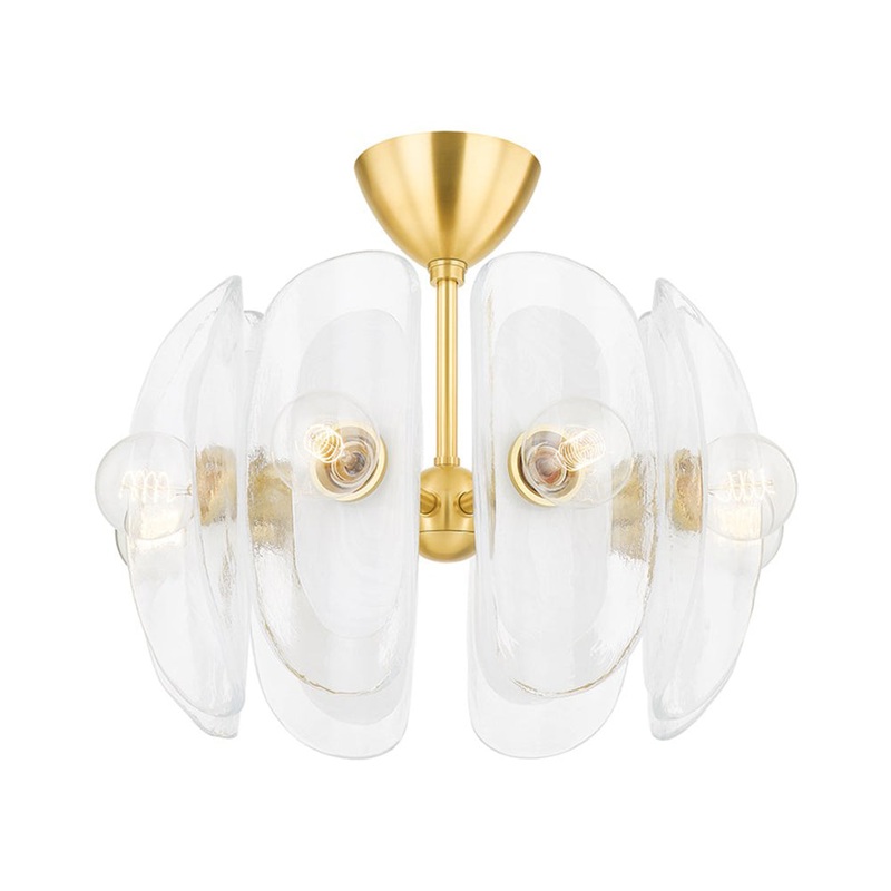 Thick plaster glass takes shape in playful strips serving as a diffuser for ambient lighting and adding playful elegance to a custom space. The Hilo Semi Flush Mount Ceiling Light from Hudson Valley Lighting adopts a bit of Art Deco whimsy mixed with industrial attitude, as chic aged brass metal details and a matching cup canopy complete an artisanal look.