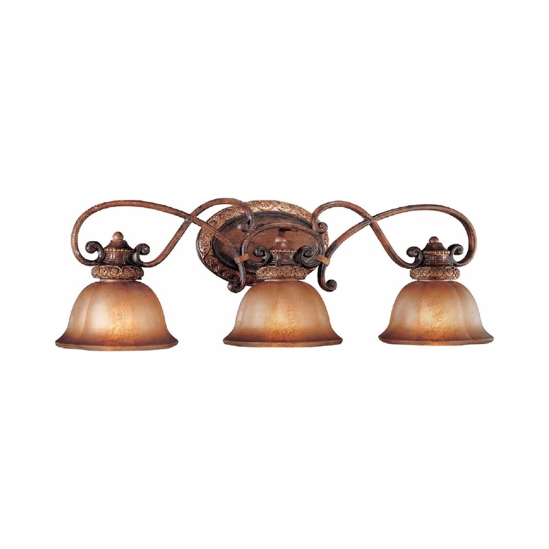 Indulgent rustic beauty marks the style ambiance of a traditional bath light with extraordinary glam influence. The Illuminati Bath Wall Light from Minka Lavery inspires with rich warmth in earth tones, including a bronze finish over alluringly curved metal framing with intricate carved detailing. Lush cupped glass shades draw out the earth-inspired palette to add an unforgettable design presence