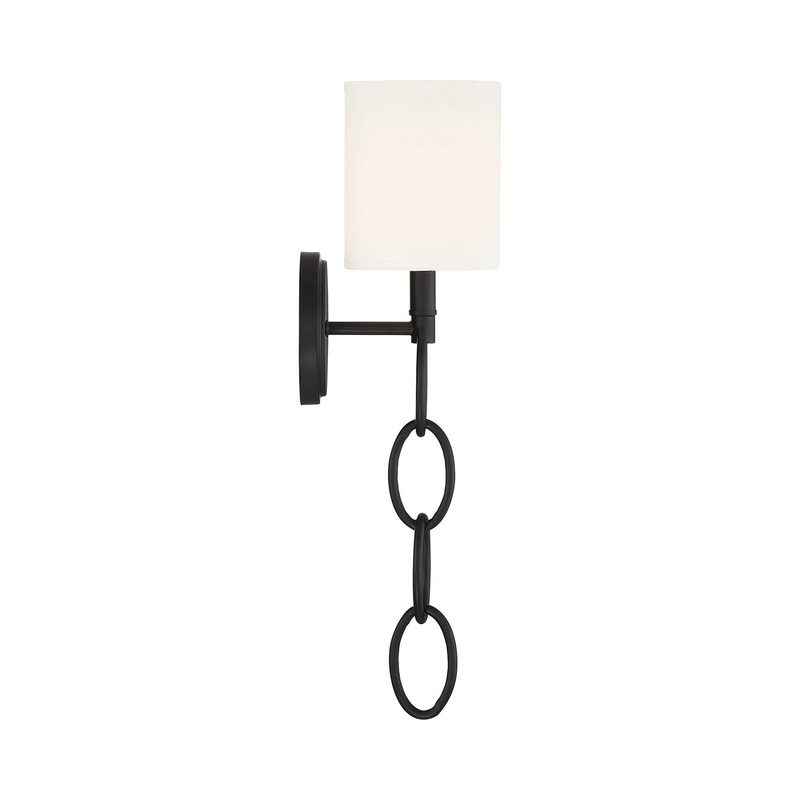 Take a playful journey with light industrial styling as the Joffree Wall Light from Savoy House becomes a compelling choice for accent lighting. Blending bold attitude with classic design, this fixture stands out to be noticed as it offers a whimsical link chain dangling from a round metal wall plate. A fabric shade diffuses illumination and reflects traditional design concepts.