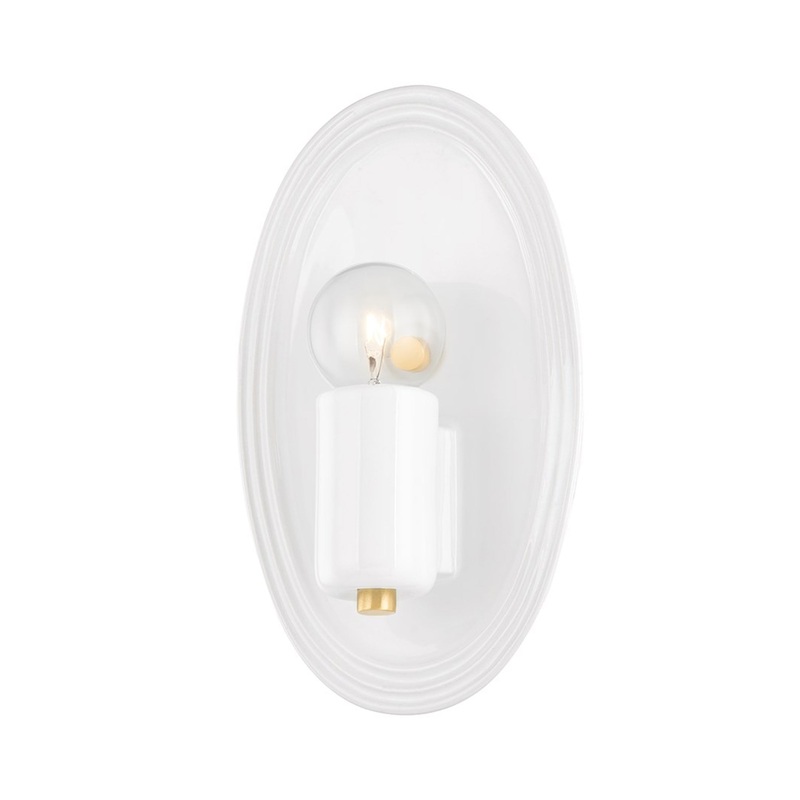 Opulence reflects a bit of classic traditional styling as the Joyce Wall Light from Mitzi infuses an artful and elegant silhouette with a clean, radiant palette. Take note of subtle dimensionality surrounding its chic oval backplate with a glossy white finish and multiple edged layers. A petite aged brass accent and vibrant white holder creates a tasteful venue for an exposed bulb.