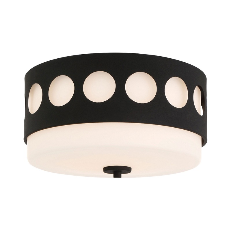 OverviewRevisit a retro era of stylish design with the Kirby Flush Mount Ceiling Light from Crystorama. Sassy and artful, its metal frame features prominent circle cutouts adding a bold flavor. Its solid white glass shade dresses up this fun fixture with a