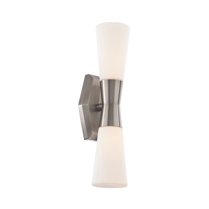 Embellishing a custom modern space, the Locke LED Bath Wall Light from dweLED meshes architecture and art with a hint of retro inspiration, blending aluminum and opal glass to shape a sleek silhouette perfect for accent lighting.
