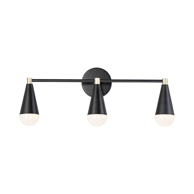 Minimal with a linear frame, the Lovell Bath Vanity Light from Maxim Lighting features three cones-shaped lamps that offer a lovely glow to bathroom countertops and more.
