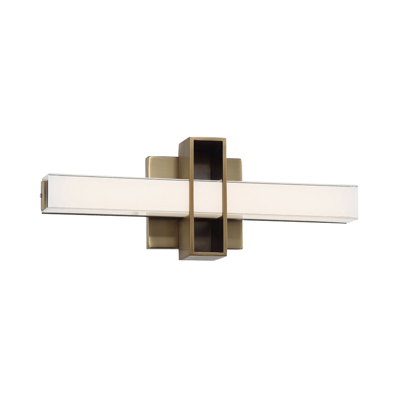 Intersecting details bring a sculptural feel and a warm aged brass finish to this Major LED Bath Bar from George Kovacs, which boasts a glass shade and dimming capabilities to set the right moods.