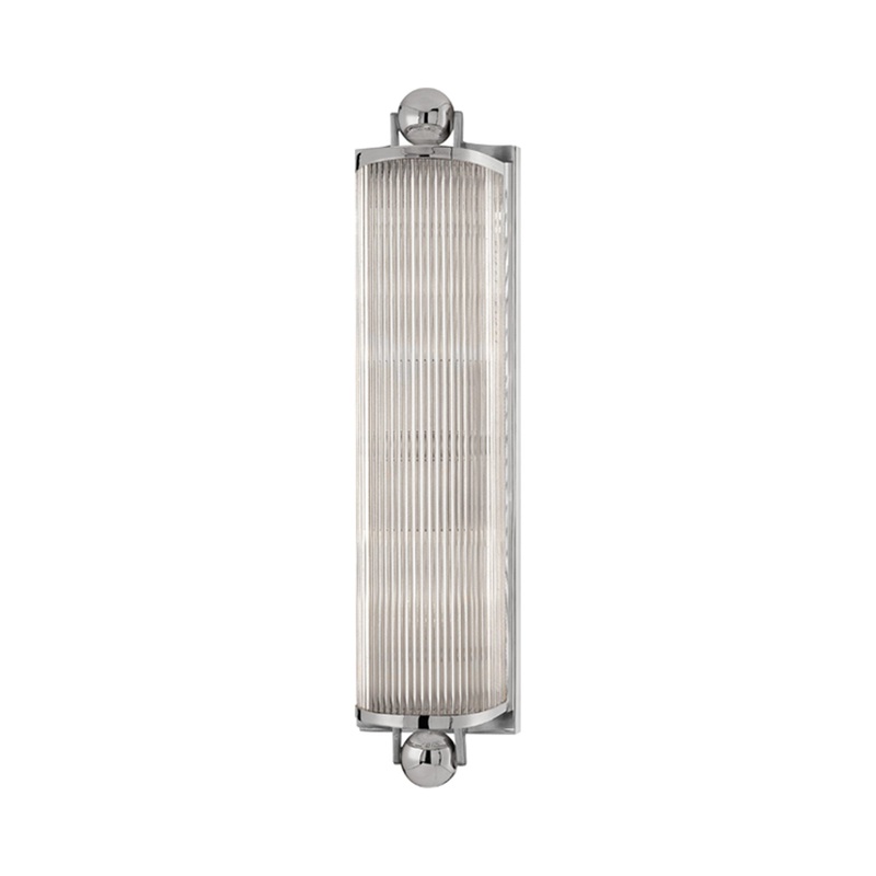 OverviewThe Mclean Bath Vanity Light from Hudson Valley Lighting hits on a timeless vintage motif, adding a sense of retro style to a master or guest bathroom. Radiant polished nickel finish metal creates an elongated frame and backplate, with charming bal