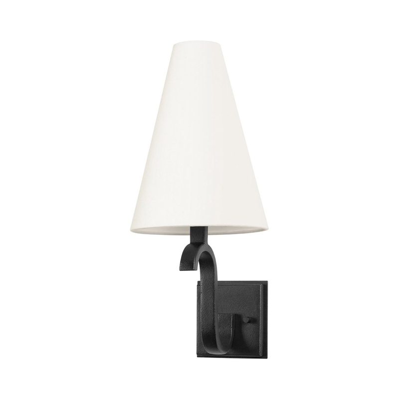 Clever design elements bring an intriguing vibe to basic shaping, adding an artful touch to the Melor Wall Light from Troy Lighting. An alluring S hook arm joining its forged iron metalwork framing embellishes the creative spin on a fixture with a striking contrasting palette. Topped with a dramatically tall, tapered white shade, it serves up a dose of attitude and a classic look of elegance.