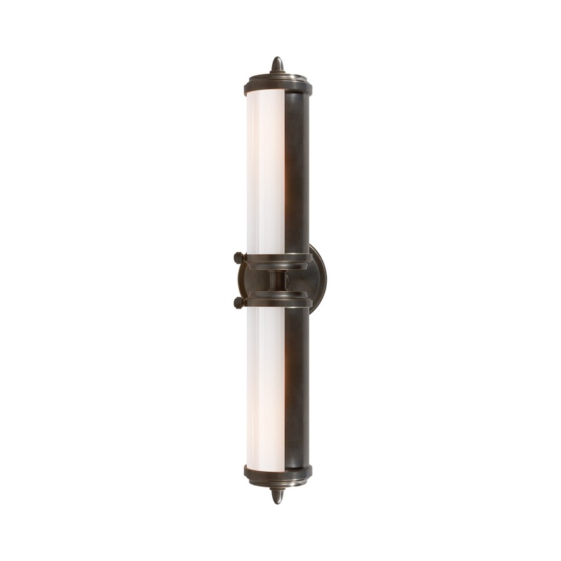 Harken back to a village setting with nautical influence, adding glowing light to a transitional bath space. The Merchant Vanity Wall Light from Visual Comfort Signature celebrates the whimsical look of barbershop retro fare with symmetry and shaping, as a metal frame with end caps secure delicate glass shades. This vanity wall light extends the whimsical feel of an updated bathroom.