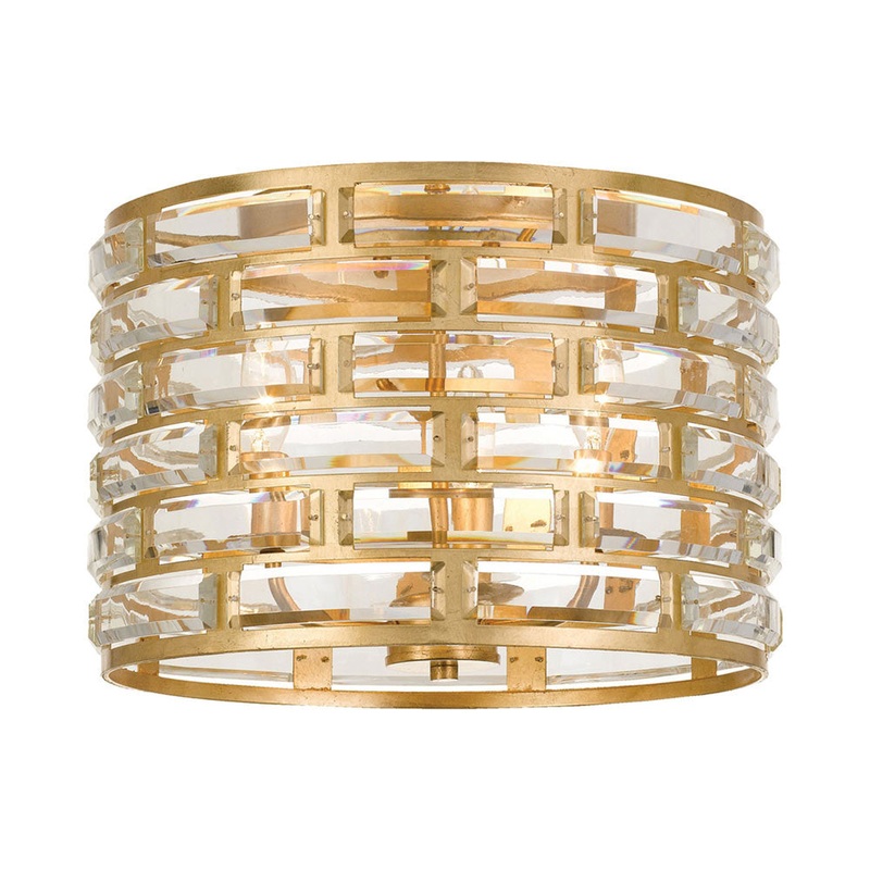 OverviewGlam hints infuse the Meridian Flush Mount Ceiling Light from Crystorama. A striking choice in antique gold, it's a rich hue and engaging texture are a perfect complement to jewel-inspired crystals that create a chic drum shade. This flushmount des
