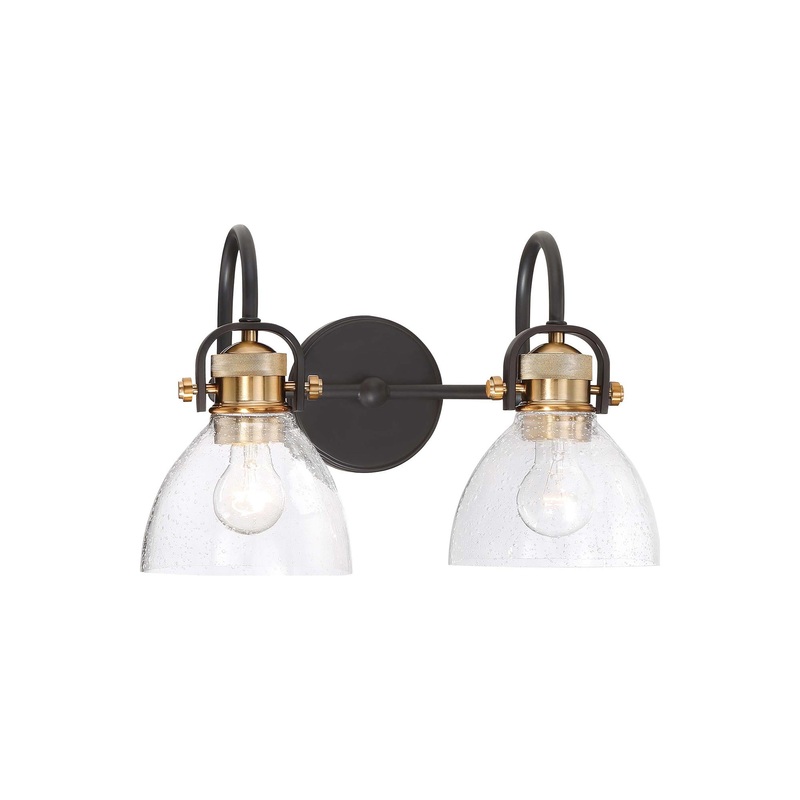 Add a metallic splash for a luxe accent with the Monico Vanity Wall Light from Minka Lavery, designed with gorgeous shiny sockets fastened in place by contrasting, dark arms and plate mount. Created with a rustic touch to the industrial modern aesthetic is clear seeded glass globes, lending a handcrafted-like organic nature.