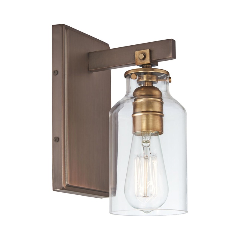 OverviewSleek industrial aesthetics shine through in the Morrow Bath Wall Light from Minka Lavery. Designed in warm tones for a luxe metallic edge, a bronze mount extends outward, securing a bell jar shape shade by rivets and a socket in charming gold high