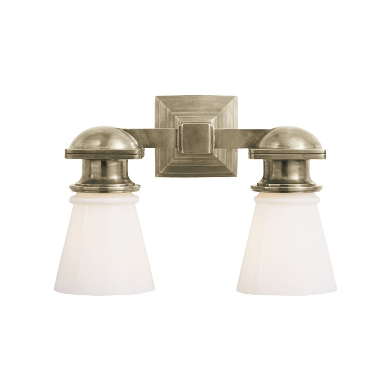 Highlight a bath vanity in style with the New York Subway Vanity Wall Light from Visual Comfort Signature, forming an Art Deco inspired look with vintage personality. This ornate fixture focuses on geometric shaping of lines and circles with a metal frame and delicate white glass shades.