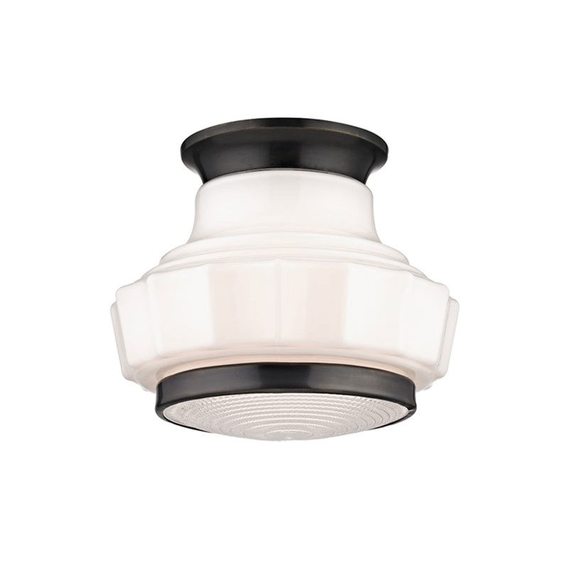 Combining a scalloped schoolhouse glass piece with an industrial prismatic diffuser in the same shade, Odessa makes an unusual and intriguing homage to early 20th-century forms.