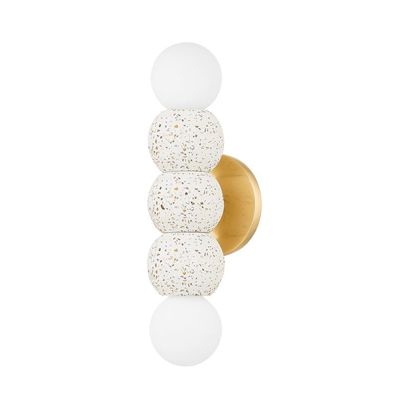 Play with art and texture when you choose the Paola Wall Light from Mitzi. A trio of terrazzo orbs center the piece, flanked on either side with glass globes that glow beautifully when the fixture is illuminated. The speckled terrazzo lends a playful vibe, while an aged brass accent finish brings the perfect hint of richness and warmth.