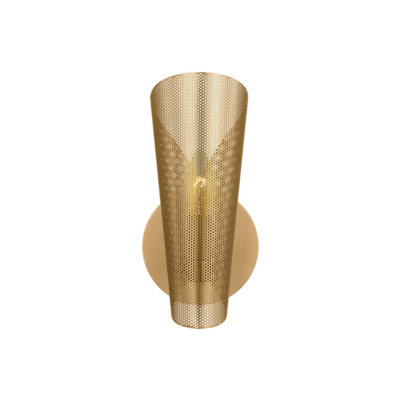 An industrial aesthetic borrows from glam influence to create the Plivot Bath Wall Light from Visual Comfort Studio, adding an enticing source of lighting for a custom bath space. Chic burnished brass finish metal delivers captivating warmth with a tapered conical mesh shade filtering light with effortless ambiance and pivots attention to the organic silhouette of a classic.