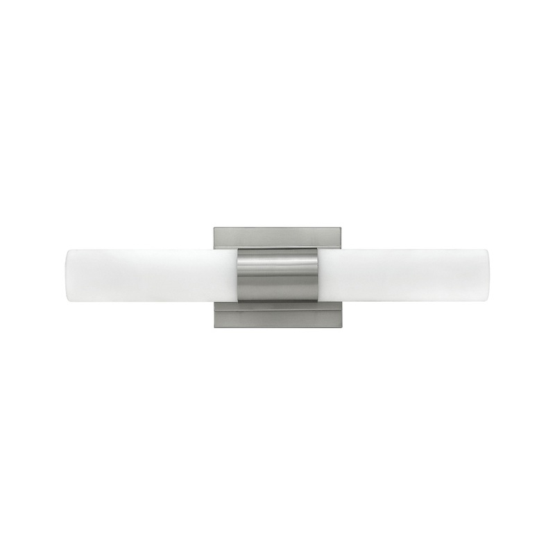 Portian LED Bath Vanity Lights slim profile unifies design and technology. A pair of blown etched opal glass cylinders extends from a center metal fixture body, creating a streamlined cylindrical form. Finished in either Brushed Nickel or Polished Nickel, this eco-efficient linear LED collection is fully dimmable and provides even, warm white light. The raceway back plate and optional junction box cover plate provide multiple mounting opportunities.