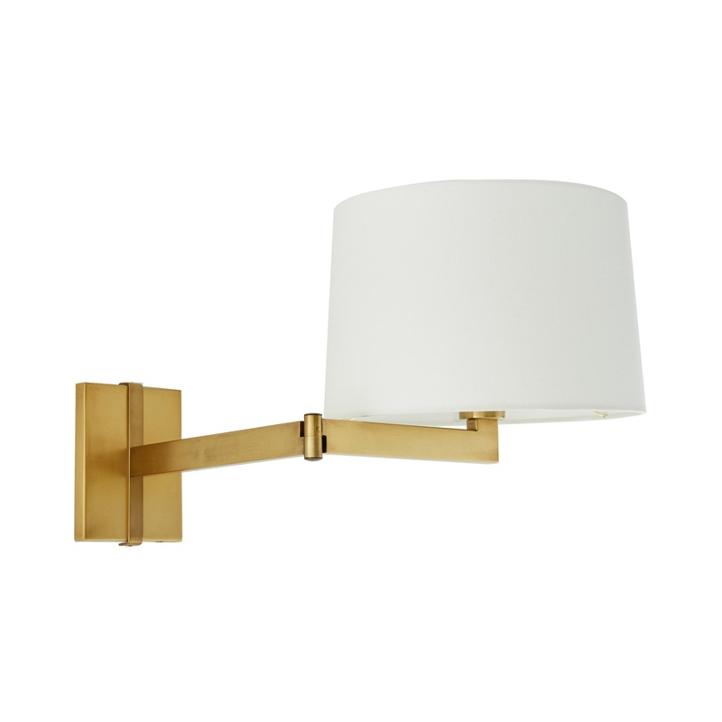 The Portland Wall Light from Arteriors brings sophistication and structural style to the forefront, adding functionality and accessibility along with ambient lighting. A conventional swing-arm style sends lighting in a targeted direction using a chic steel frame with linear accents. A classic drum shade filters reading and accent illumination perfectly.