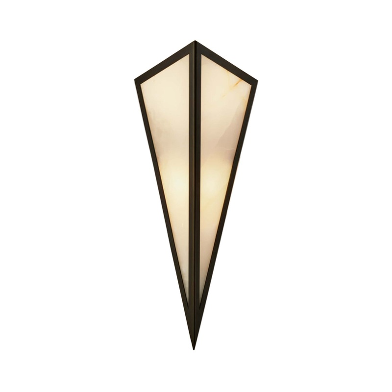 An irresistible art form blends two basic finishes into a geometric phenomenon, creating the Priestly Wall Light from Arteriors to change the mood in a transitional or modern setting. Triangular with faceted sides made of white onyx plates, this fixture is framed in English bronze iron, forming a straightforward silhouette with dimension and a bit of Art Deco influence.