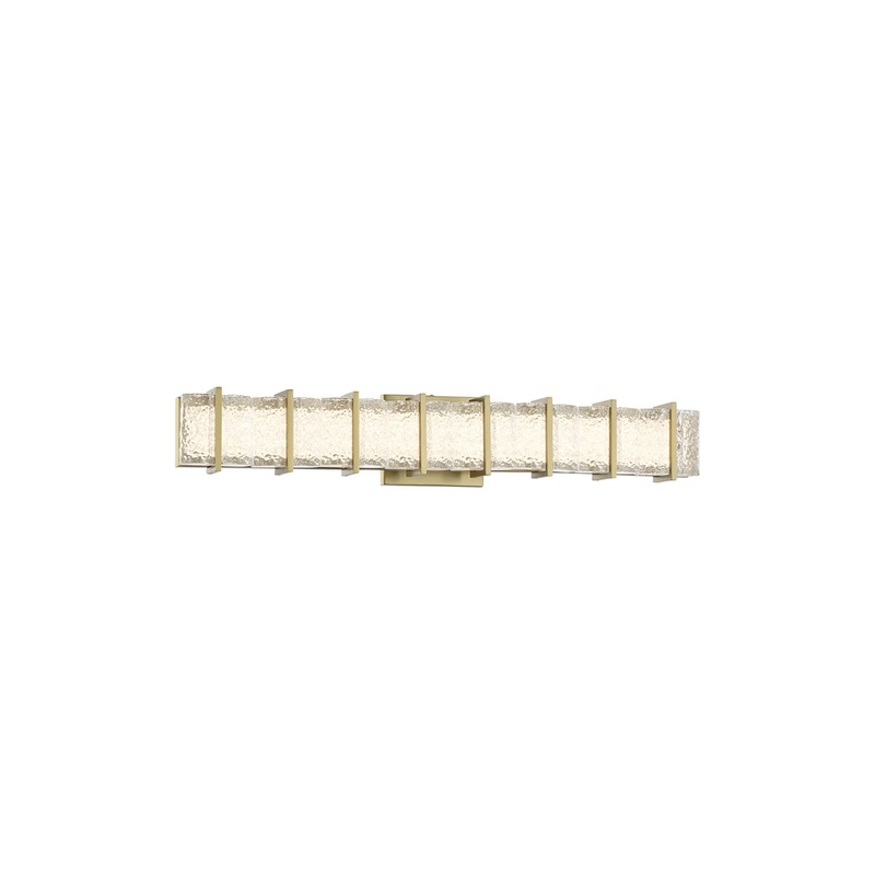 Look for an inviting blend of artisanal style and organic calm with a light fixture styled to make an impact. The Sevryn LED Bath Vanity Light from Minka Lavery captures an earthy flavor with linear metal framing and textured crystal glass coexisting in a decadent manner.