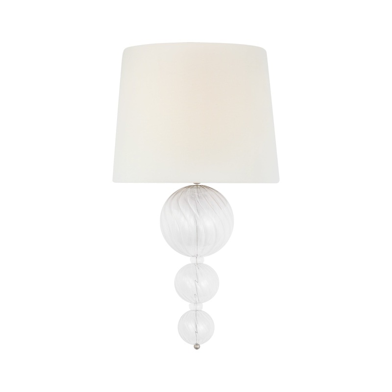 Graduated orbs of clear swirled glass create a sense of structure and restrained elegance to the Talia Swirled Glass Wall Light from Visual Comfort Signature. The delicacy of its trio of glass baubles complements a chic tapering drum shade, casting a soft, inviting glow across your living area or bedroom.