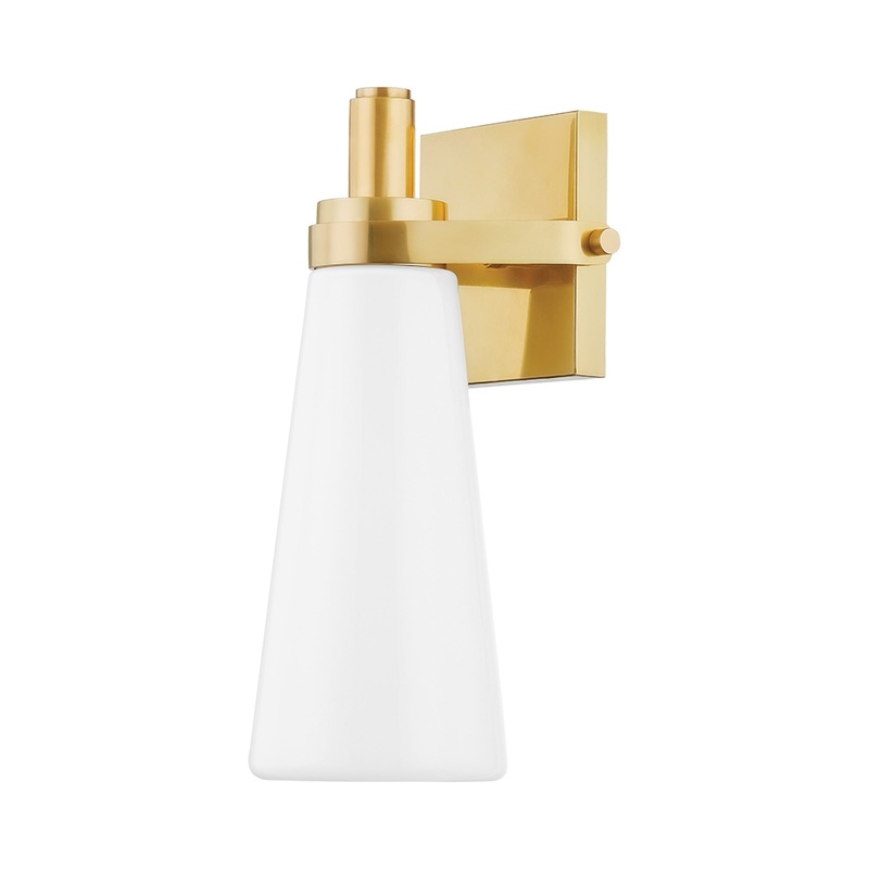 Refinement and simplicity turn out to be a design delight as the Trude Wall Light from Hudson Valley Lighting focuses on silhouetting. We love the crisp conical opal glossy shade for its delicacy and filtering of illumination. Set within metal framing, this sconce-style fixture becomes a sophisticated entry to any setting.
