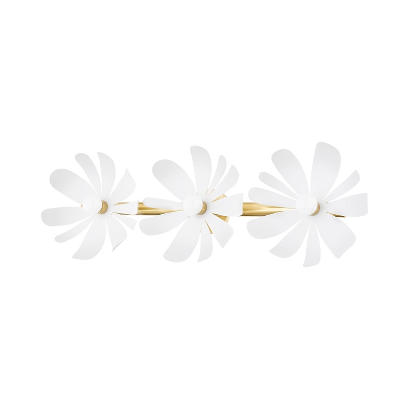 OverviewWith a stem-like aged brass metallic frame projecting a trio of blooming flowers, the contemporary Twiggy Floral Vanity Wall Light from Mitzi offers a nature-inspired look and feel to bathroom retreats. Whimsical and charming, this modern glam vani