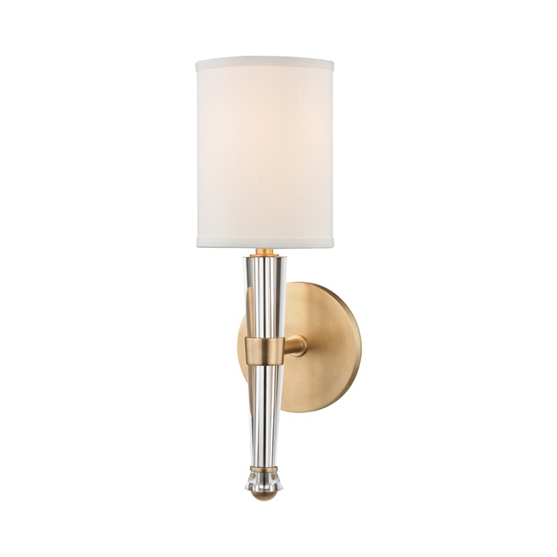 The Volta Wall Light from Hudson Valley Lighting updates a traditional motif with tapered silhouetting of its gleaming metal arm, capped with a round accent detail. Contrasting finishes set up a round metal backplate to mix up a chic palette, as a decadent tall silk shade refines optical proportion.