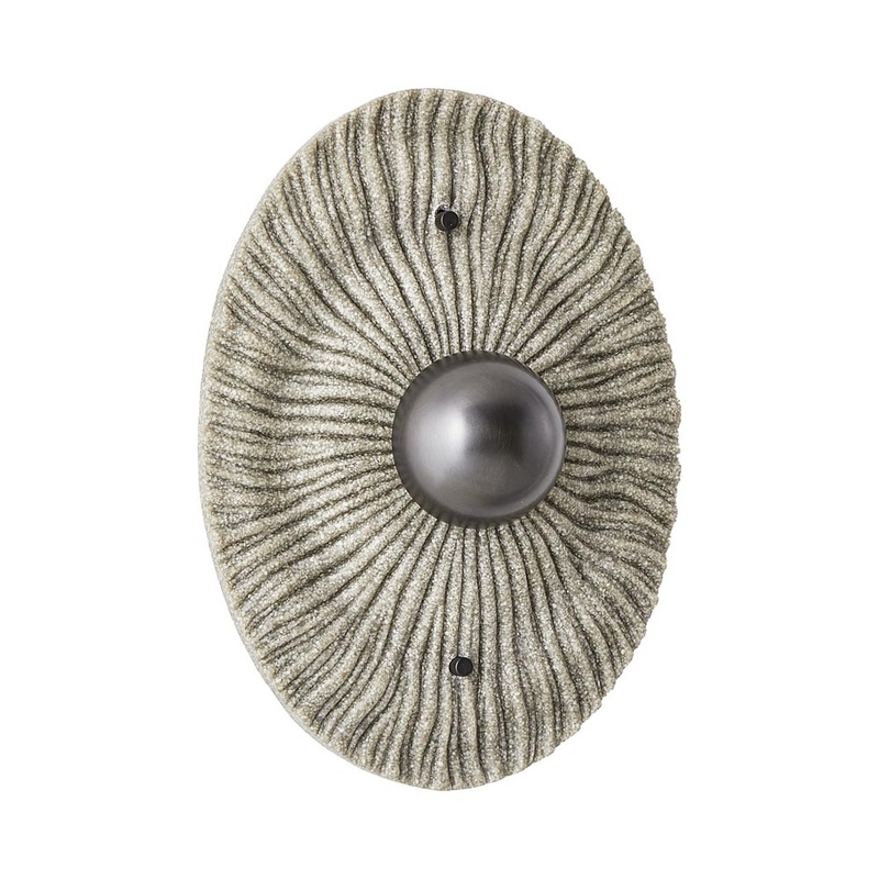 The Yesenia LED Wall Light from Arteriors features intense textural and sculptural elements, reminiscent of a coral reef. Coastal elegance brings artistry along to create a smooth, eco-forward aesthetic, with charcoal rice stone composite joining English bronze steel in a layered circular shade configuration. Soft illumination glows through its center, highlighting curved lines that replicate sun rays.